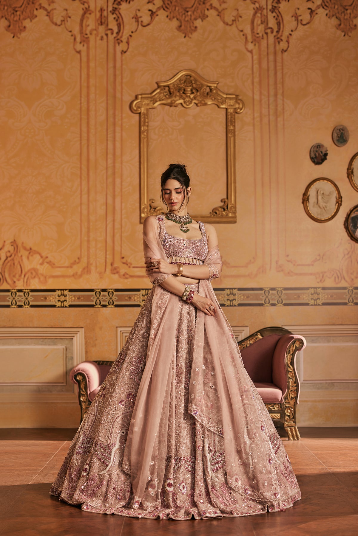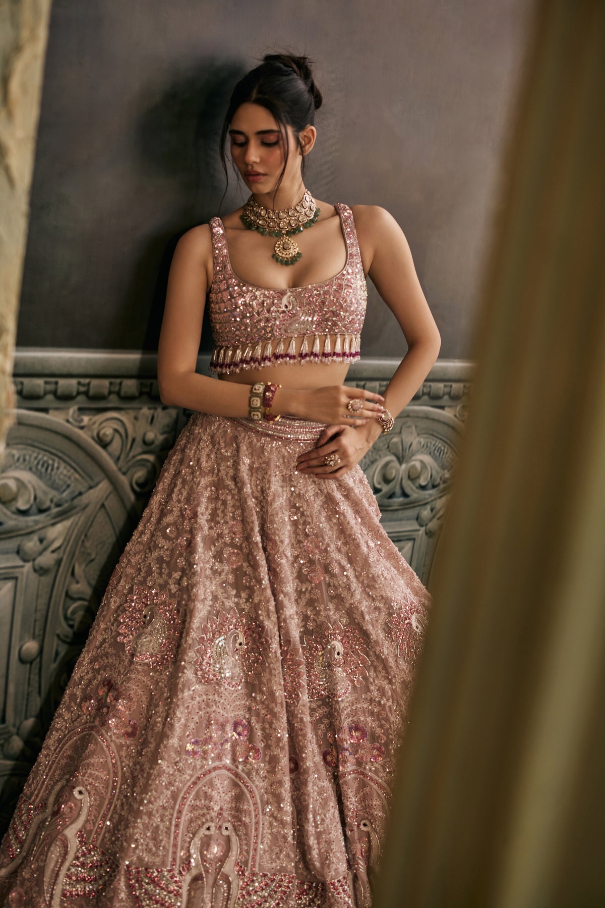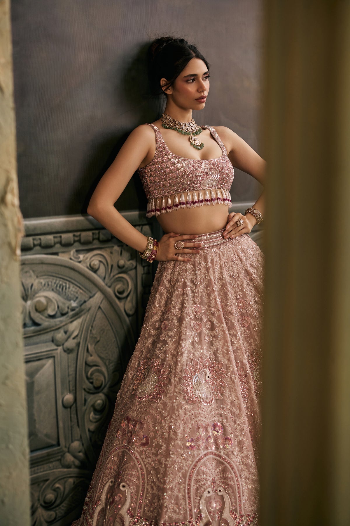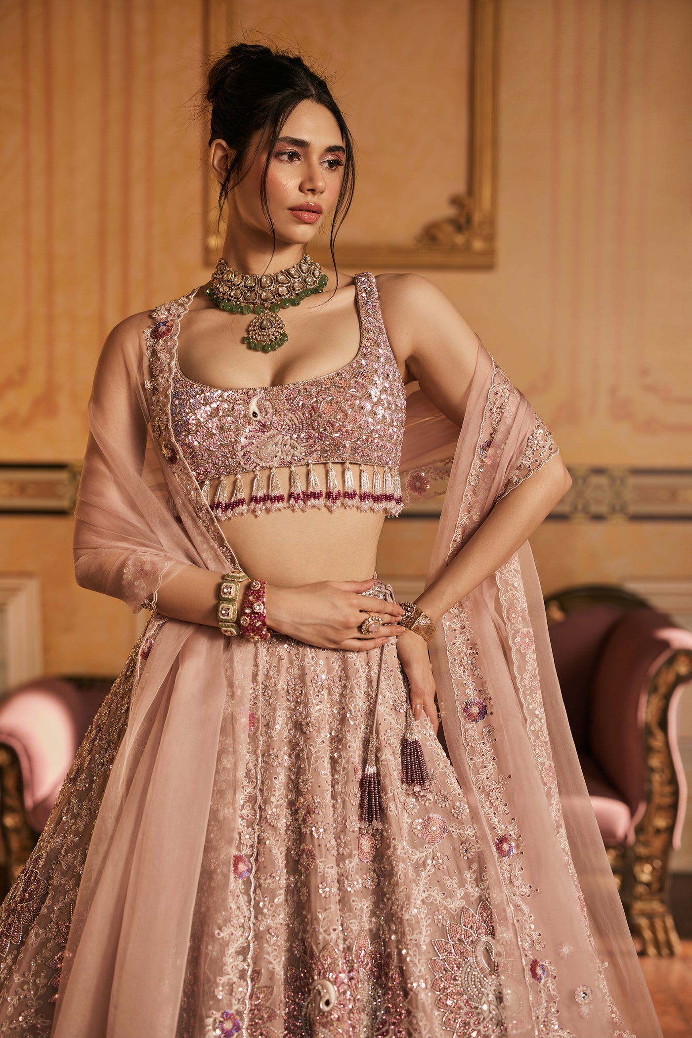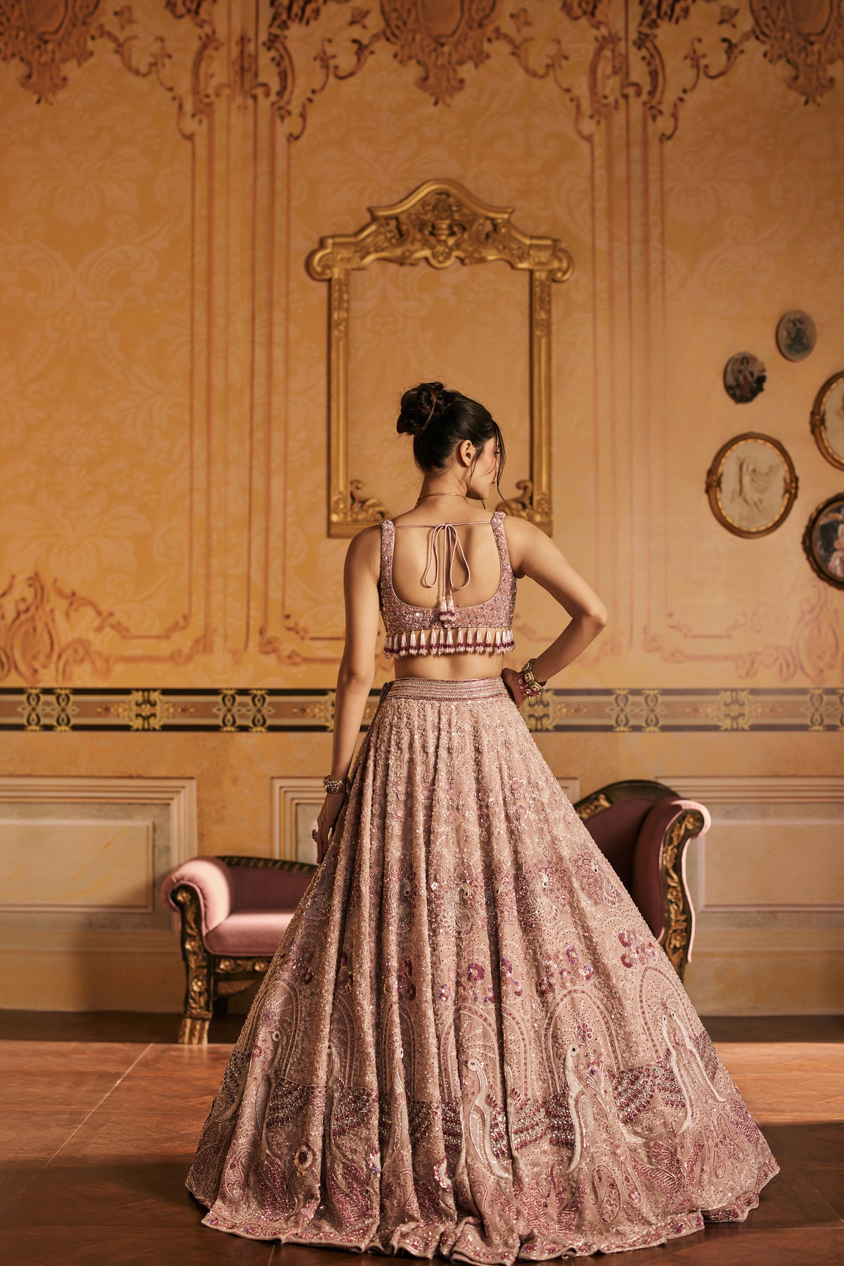 Amaira is spun from the pages of a forgotten fairytale, a lehenga born in blush skies and soft white clouds, where swans glide across still waters and peacocks dance in twilight gardens. The entire ensemble is hand-embroidered with intricate motifs of swans and peacocks, each thread telling a story of grace, beauty, and divine elegance. The blouse shimmers with detailed embroidery and delicate tassels that sway like whispers in the wind, adding a playful charm to its regal silhouette. Draped in this enchanted piece, the wearer becomes the muse of her own fairytale ethereal, radiant, and utterly unforgettable.