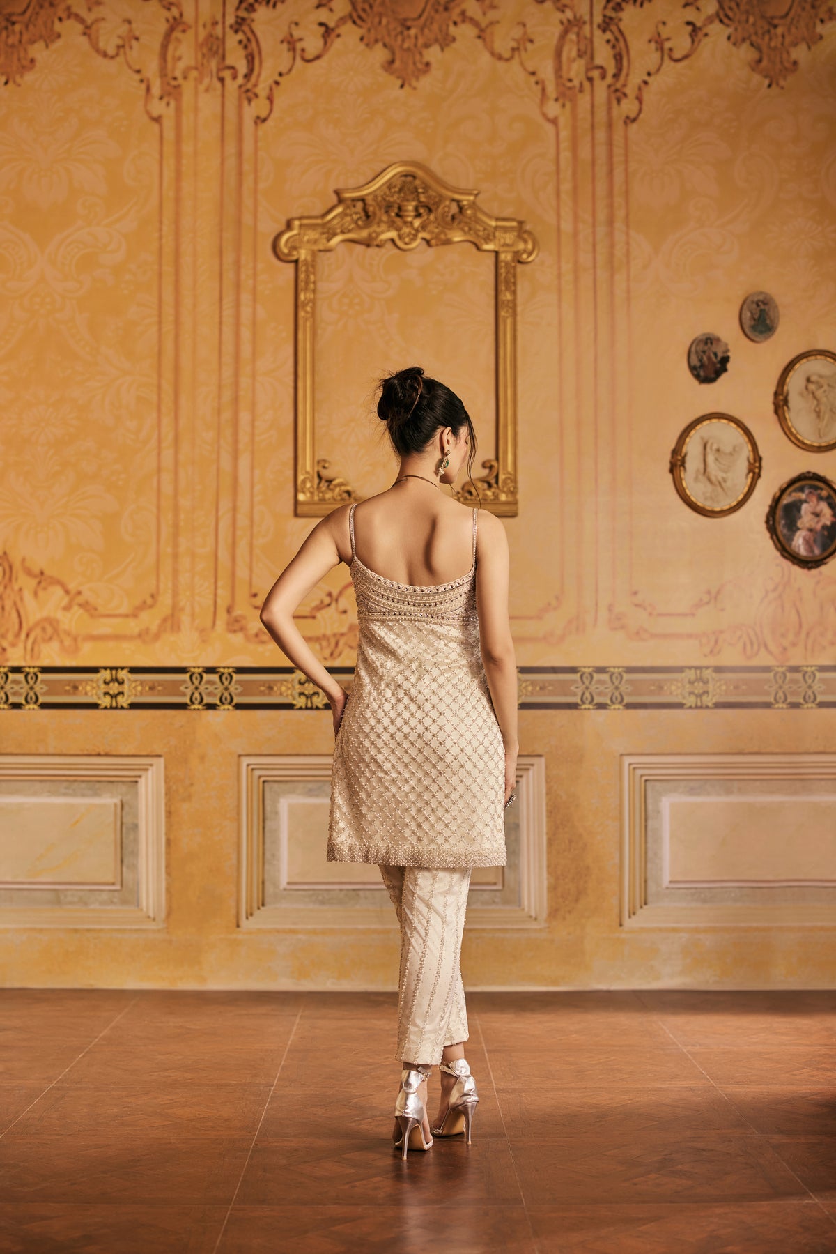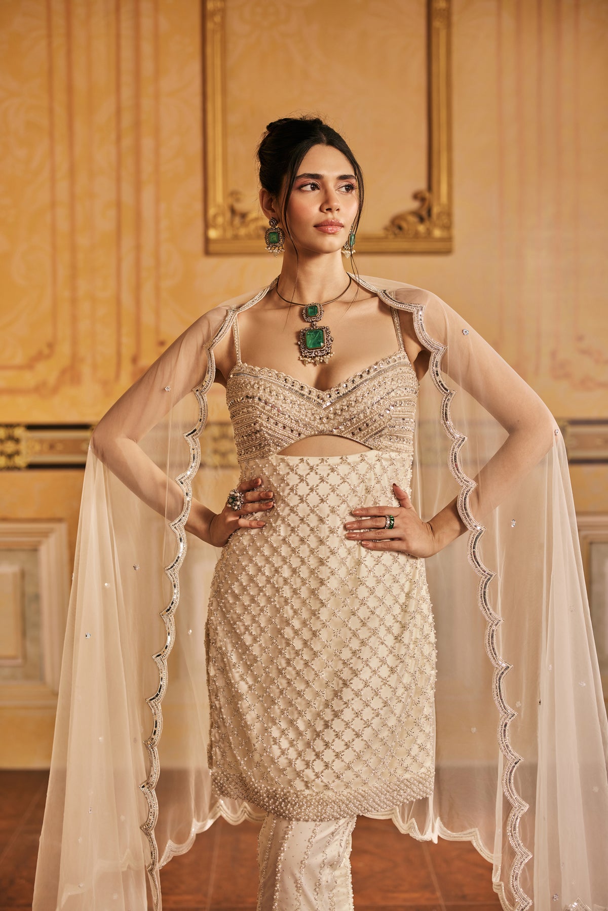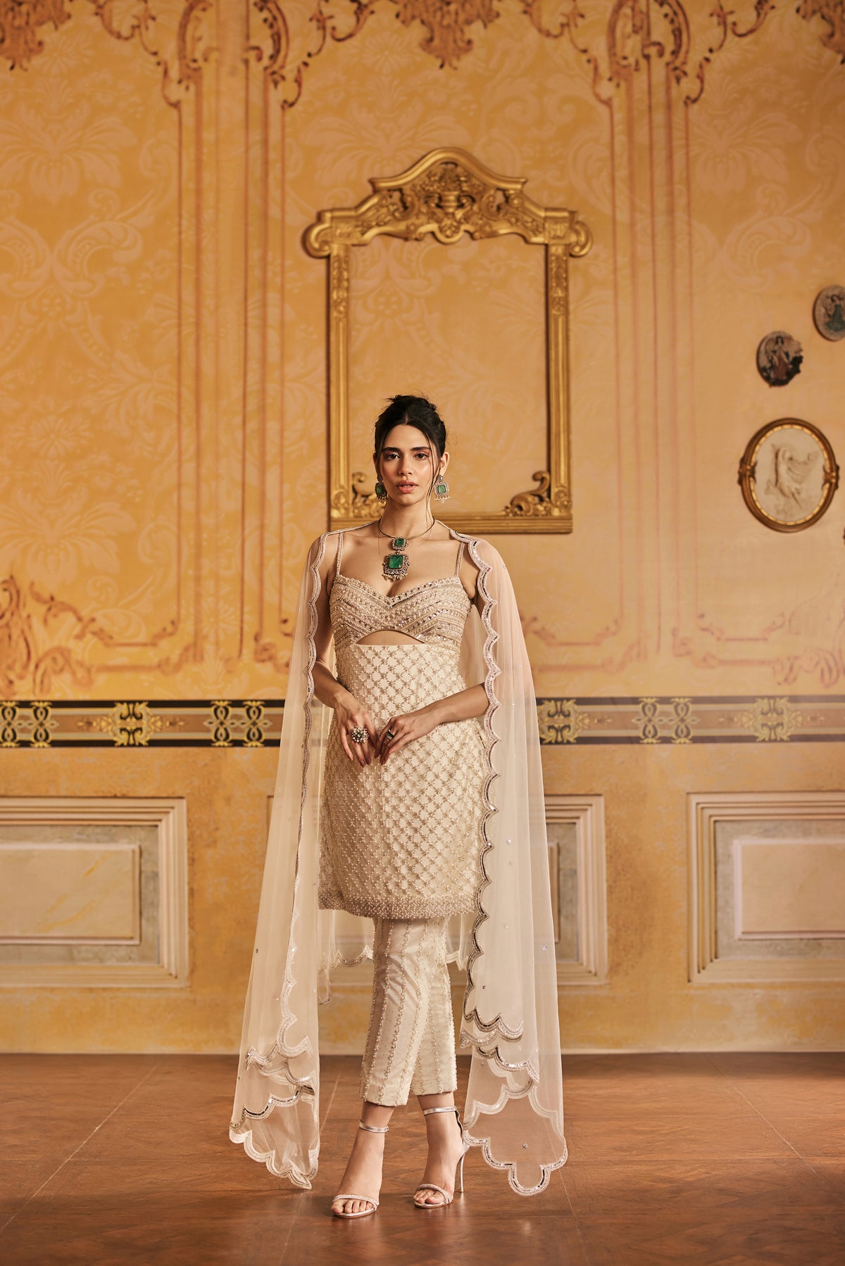 In a palette as soft as morning light, Iraaya is a cream white ensemble that whispers elegance. The kurti, pants and dupatta are delicately hand embroidered, catching the light in quiet, refined glimmers. A sheer pure organza dupatta floats around her, edged with dainty hand embroidered detailing. It’s a look for the woman who moves like poetry, graceful, grounded, and entirely unforgettable.