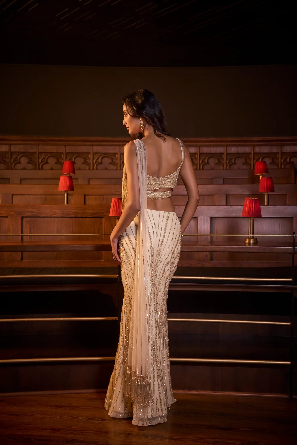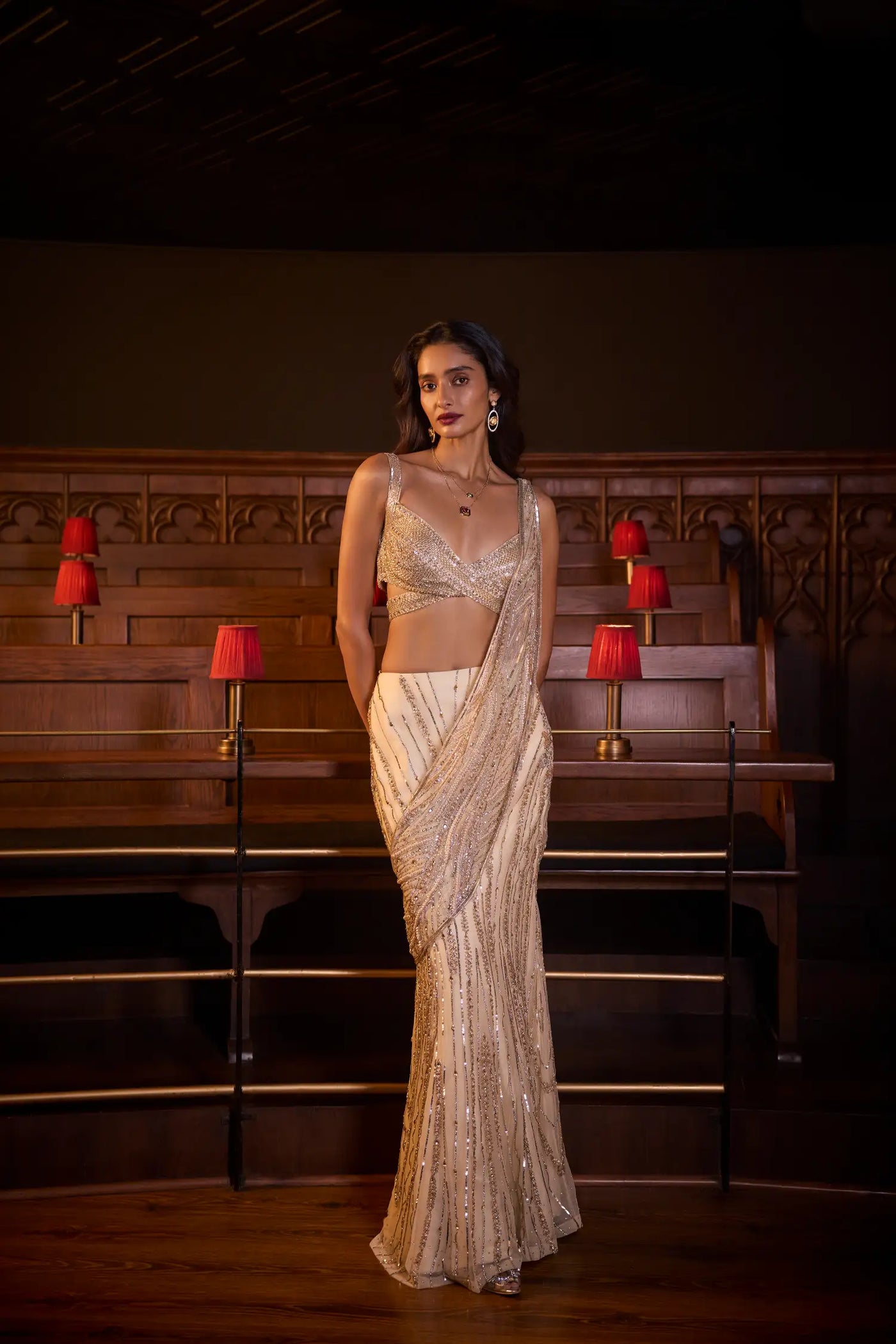 Pre-draped sari in an elegant gold hue, handcrafted on pure tulle fabric. Features exquisite hand embroidery embellished with katdana, sequins, stones, and crystals. Paired with a contemporary blouse, the ensemble is crafted using premium, high-quality materials.