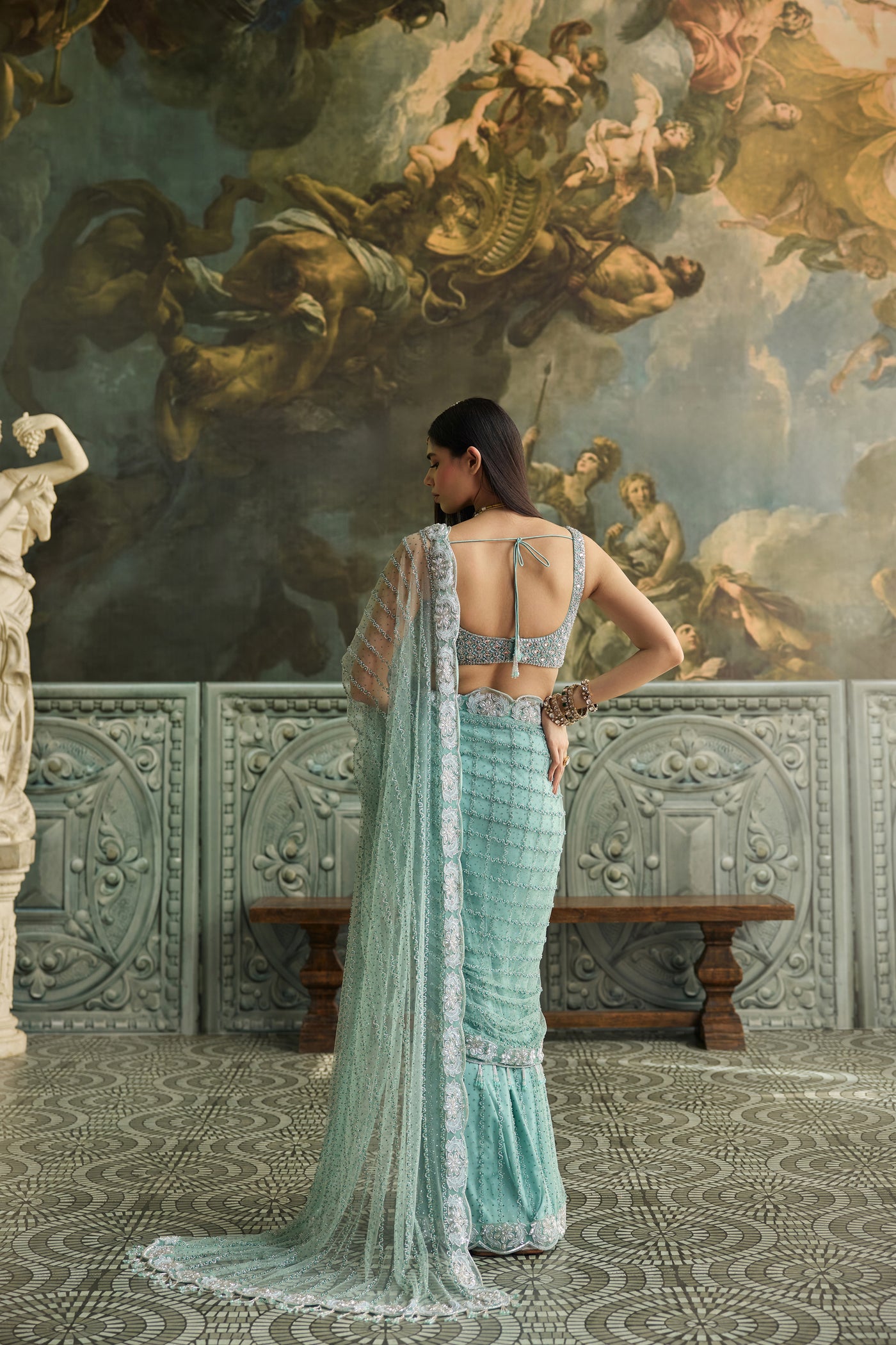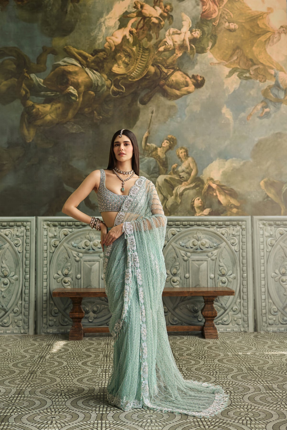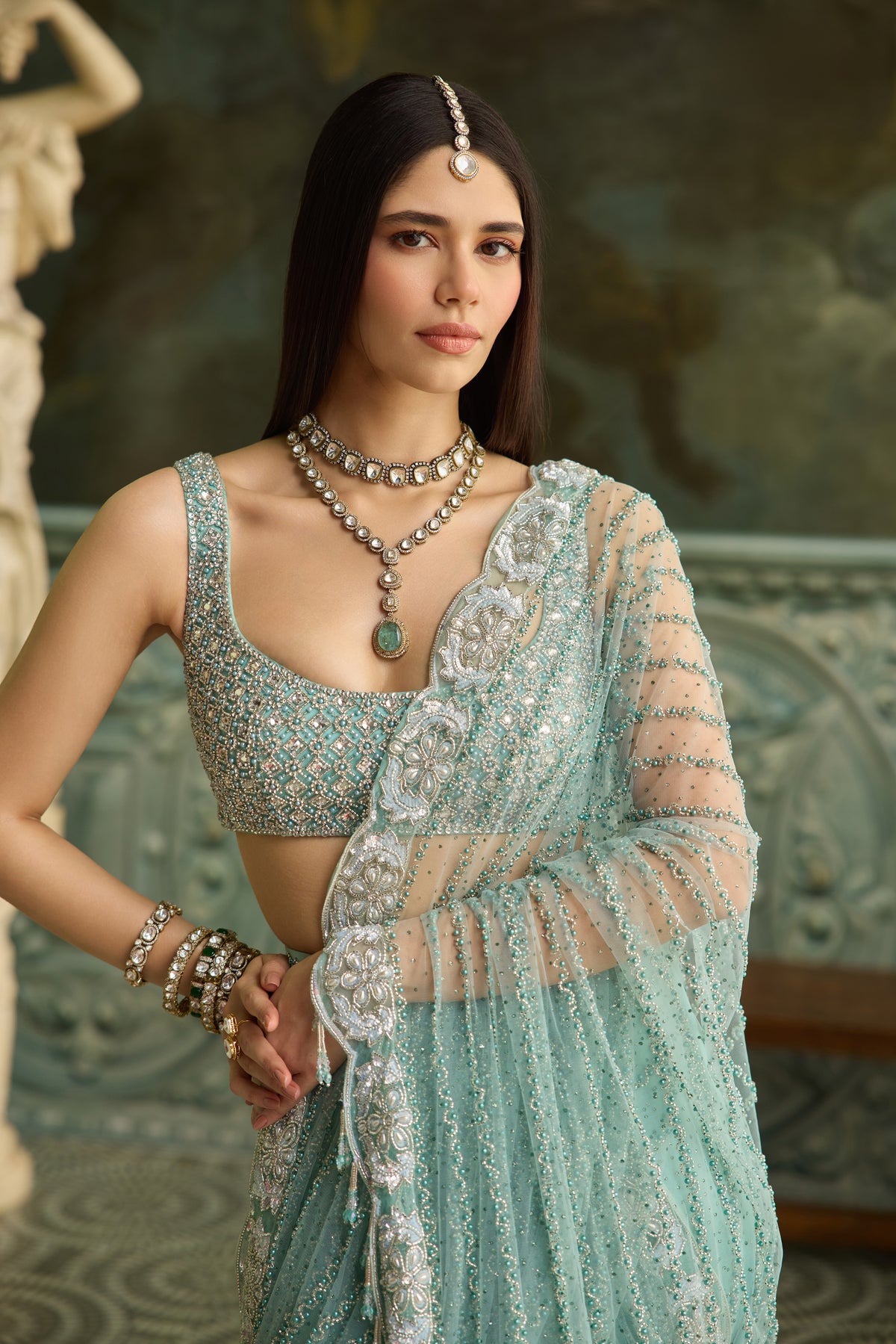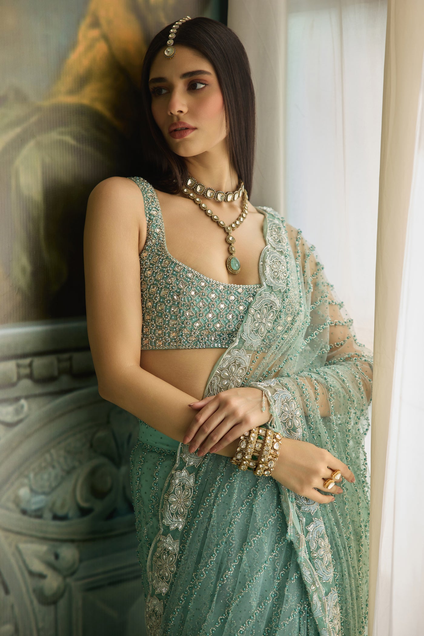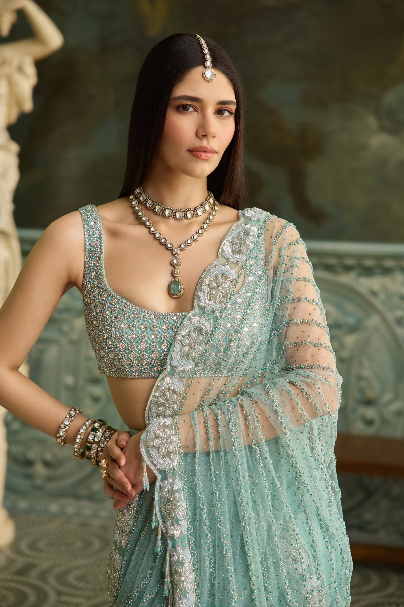 Zeina is a vision in pastel green, a saree that evokes timeless charm. The blouse, fully hand-embroidered with intricate artistry, while delicate embellishments grace the saree, adding just the right touch of shimmer and finesse. Soft, graceful, and radiant, Zeina is perfect for intimate celebrations and elevated evening affairs.